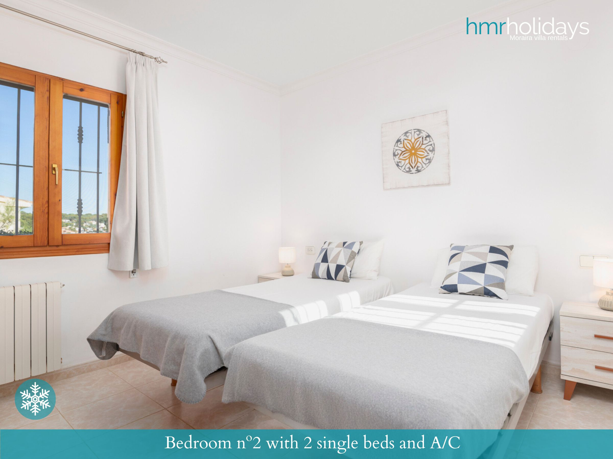 Disfruta del alquiler vacacional perfecto en Moraira con nuestra acogedora y totalmente equipada villa, situada a solo 800 metros de la impresionante playa de arena El Portet. Esta encantadora villa de 110 m² cuenta con tres dormitorios, alojando cómodamente hasta seis personas, lo que la hace ideal para vacaciones en familia.